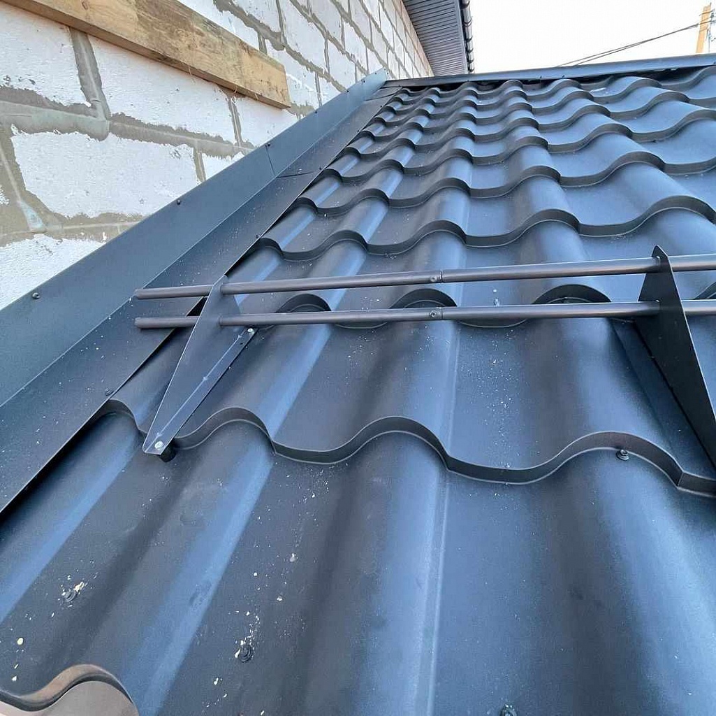 Устройство предназначено исключительно для фальцевой кровли. В наборе имеются комплект крепежей и плоских пластин, заворачивающихся в стоячий фальц без повреждения металла кровли.